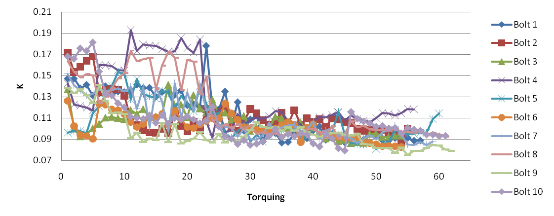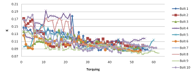 The graph below shows the individual values of K for each bolt during each torque cycle. The high nut factors from 1-25 cycles is due to the minimal lube applied. The large drop in K is from a liberal application of wet lube. What this graph shows is that 1) lubricating your bolts reduces the effect of “nut factor creep” due to reducing wear particle generation (which is the function of a lubricant) and 2) less scatter from one bolt to the next (indeed, the range of K is very narrow at around K=0.08 to K=0.12).