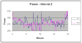 I’ve taken the liberty of averaging the power data to smooth it out. The plots below for power represent a rolling average over 18 seconds. The blue curve marked P1 is from late October 2007 on regular cranks. The pink one labeled P2 is from early November 2008 on Powercranks. The first Powercrank interval got a little buggered up 18 minutes in due to a schoolbus interfering with the interval. Both intervals are pretty darn close to each other.