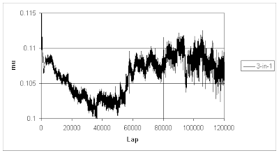 If I envelope my top 20 performances in a year I get the data below for normalized and average powers from 3 to 180 minutes. The solid red line represents the current season since starting with Powercranks, and the dashed red line is an average of the 2004-2009 data with error bands (one deviation plus/minus). Within a given year, the deviations are on the order of 3-6 W, indicating high repeatability in my performances. For the cumulative period of 2005-2009, the deviation is on the order of 2-4 W, within the tolerance of the Powertap itself.