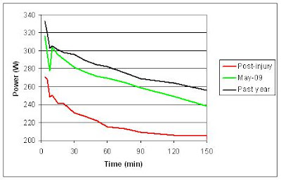 The good news is I'm back to doing threshold work and I'm just about pain free. The bad news is I've got a long way to go before my power is back where it should be. I'm thinking I'll be able to make some good gains this week and pop that bottom curve up quite a bit. We shall see...