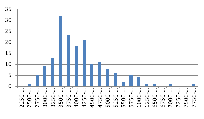 Now when you lubricate bolts, things get quite different. In the first round of testing, I wasn’t completely sure how much lube to apply, so I put just a light coating of wet lube on the threads. I then performed 35 tests with 4 randomly selected bolts from the lot of 10 bolts. The final bolt load distribution had a fairly normal distribution, which was certainly odd, as shown below. This series of tests produced preloads from 5529 lb to 12415 lb with an average of 8988 lb, leading to K=0.119, Kmin=0.086, and Kmax=0.193 and the preload ranging from -38.5% to +38.1% of nominal.